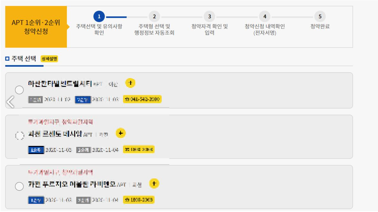 순위에 해당되는 주택(아파트) 중에서 원하는 곳을 선택 후 다음 버튼 *유의사항 체크 !